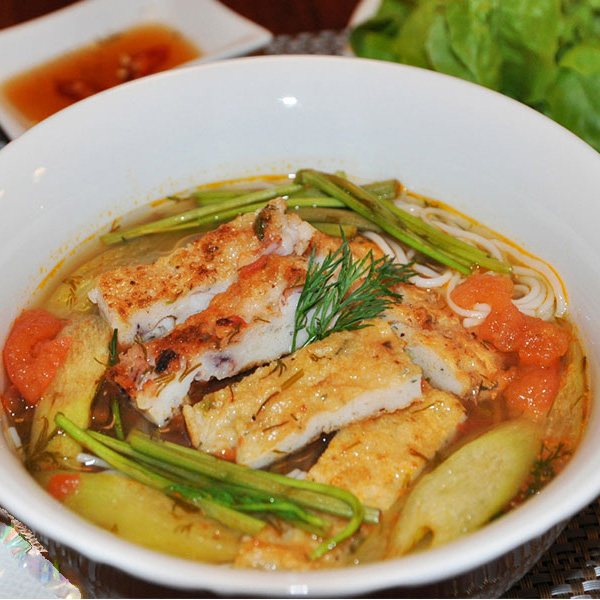 Một bát bún chả mực nóng hổi có nước dùng trong veo, ngọt thanh từ xương và đầu tôm, thêm vài lát cà chua đỏ, hành lá xanh rắc lên. Nhưng tất cả chỉ thực sự “đúng điệu” khi có miếng chả mực vàng ươm, giòn sần sật, cắn một miếng đã thấy cả hương vị biển cả.